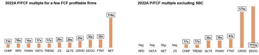 Värderingsmultipel (P/FCF) före och efter justering av SBC för ledande utvecklare av cybersäkerhetslösningar. Källa: Coeli Global, Capital IQ.