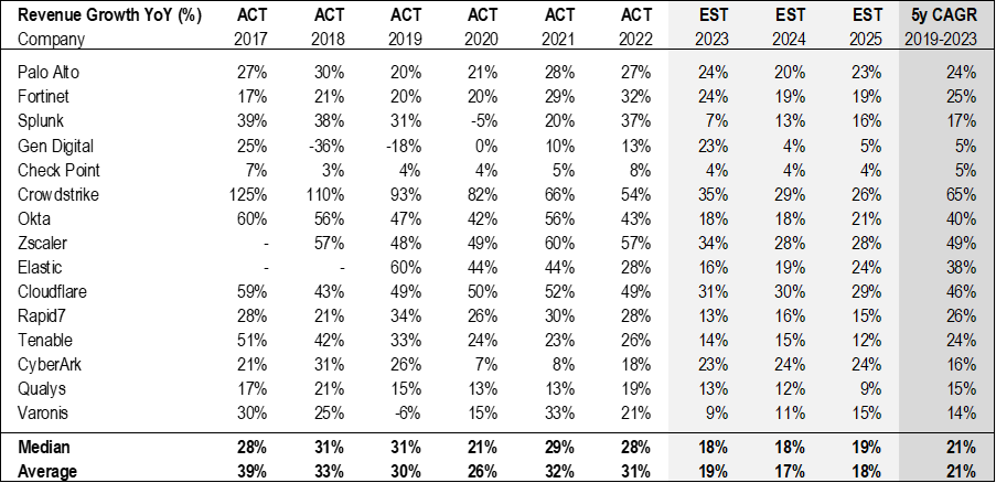 I bilden nedan kan ni se den årliga tillväxten för några av de största cybersäkerhetsbolagen i världen. De senaste åren har de som grupp vuxit med nära 30% per år. Och framåt förväntas de växa med runt 20% per år. Notera att de historiska siffrorna är total tillväxt som inkluderar förvärv och valutaförändringar.