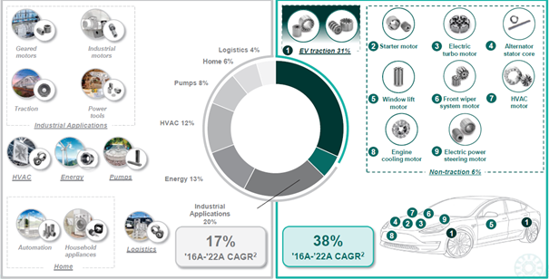 Bild 2: Stödjer ledande kunder inom en rad olika applikationsområden. Siffrorna i bilden baseras på FY2022 och dessa har ändrats en hel del under FY2023 (källa: Eurogroup Laminations)