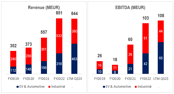 Segmentet EV & Automotive växte med 38% per år mellan 2016 och 2022 och segmentet Industrial växte med 17% per år under samma period. Och framåt är förväntningarna höga. Bolaget har som mål att fram till 2025 växa omsättningen med 22-25% per år och EBITDA med 27-29% per år.