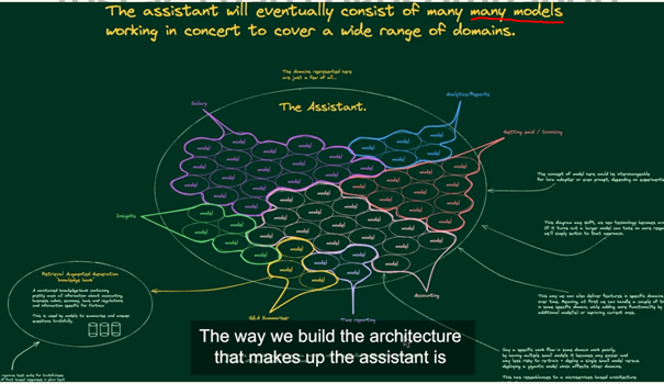 I stället för att bara skapa en stor modell har Fortnox byggt upp sin AI-modell med många små modeller som sedan skapar den stora modellen. Små modeller är lättare att drifta och träna än en större fullskalig modell. Om man behöver träna om en modell så är det lättare att ändra små modeller än en stor. Fortnox lägger mycket tid på kunskapsbanken (bestående av lagar och regler m.m.) för att undvika ”dåliga svar” från modellen. Fortnox trycker också på att datasäkerhet är väldigt viktigt då man till exempel inte vill ha in några hackare i systemet.