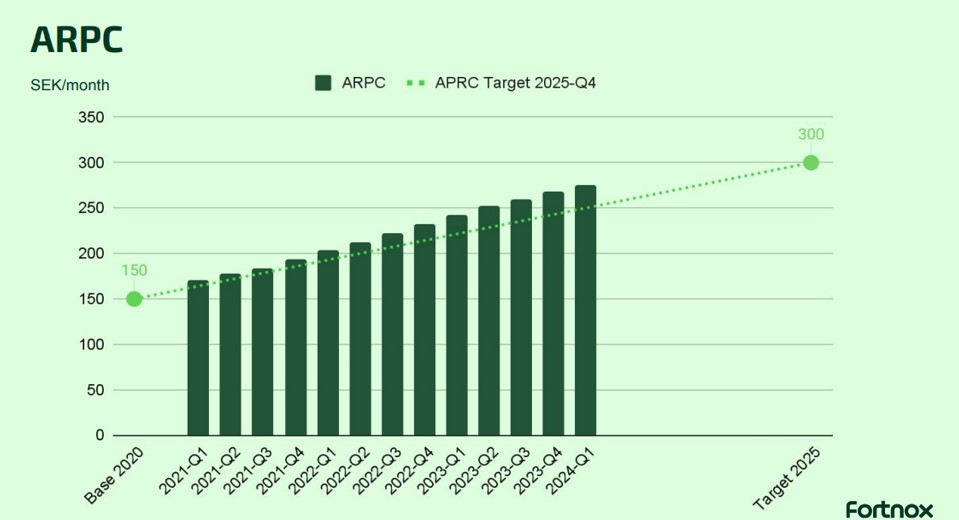 Bild: Fortnox ligger över sin trendlinje gällande genomsnittlig intäkt per kund. Att de ligger före tolkar jag som att de har ett bra erbjudande till kunden vilket gör att kunderna köper fler och fler moduler samt att bolaget har höjt priserna. Källa Fortnox.