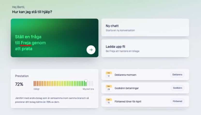 Bild: En ”screen shot” från Fortnox AI-program från kapitalmarknadsdagen. Fortnox AI-assistent heter Freja. Källa: Fortnox.