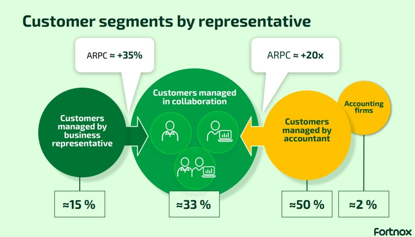 Average Revenue Per Client (ARPC) är ett nyckeltal som Fortnox använder för att mäta hur mycket genomsnittkunden köper på plattformen. Förutom att kunderna själva köper moduler så fungerar de 9000 redovisningsbyråerna, som använder Fortnox, som en försäljningskanal. Drivaren för redovisningsbyråernas försäljning är ganska enkel, ju mer data som kunden själv lägger in i systemet via modulerna, desto bättre data får byrån för den löpande bokföringen och bokslutet. Om inte kunden lägger in data i systemet så får ju byrån göra det själv i stället. Bilden nedan visar att ARPC ökar med 35% om det är en bolagsrepresentant som styr över modulinköpen och om en byrå styr över inköpen ökar dessa med 20 gånger! Idag har Fortnox samarbeten med 9000 byråer och målet är att ha 12 000 byråer om några år.