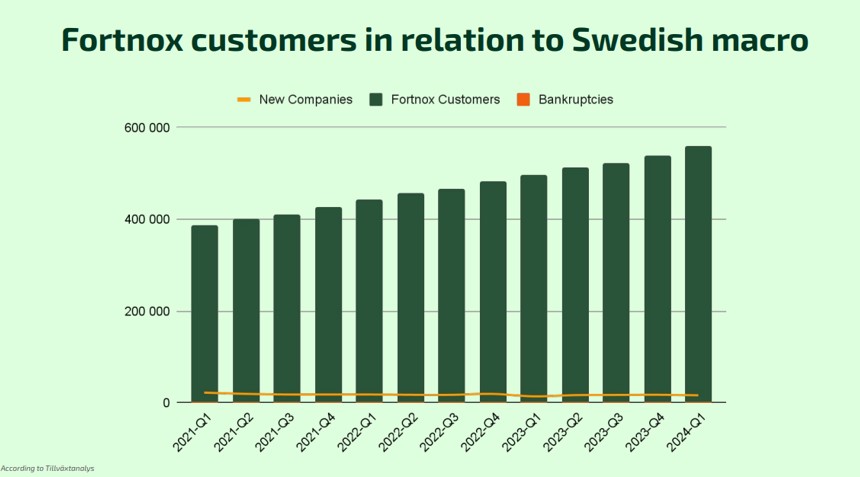 Fortnox adresserbara marknad är idag 1,6 miljoner svenska bolag (aktiebolag, firmor och föreningar) och idag har man strax över 500 000 bolag på sin plattform. Trots att en hel del bolag i Sverige går i konkurs så är det ändå ett ganska stort nettotillskott av nya bolag varje år.