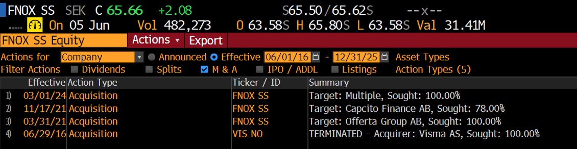 Bild: 2016 aviserade Visma ett bud på hela Fortnox som huvudägaren Olof Hallrup tackade nej till. Källa: Bloomberg.