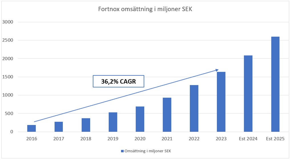 Bolagets omsättning har växt med cirka 36 % varje år sedan 2016 och omsättningsprognoserna nedan visar att Fortnox kommer fortsätta att växa vidare både under 2024 samt 2025, och förmodligen under många år framöver.