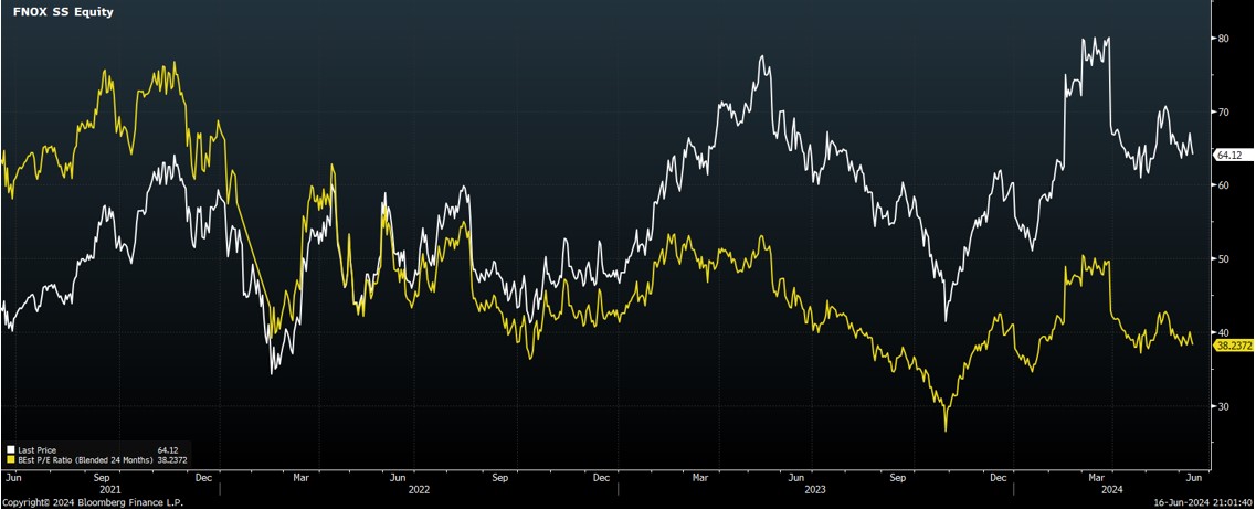 Fortnox handlas för närvarande (2024-06-14) till en värdering motsvarande 38x gånger vinsten för 2025. Om jag tar hänsyn till all den tillväxt som finns kvar i bolaget (ökad försäljning av bolagets tjänster, flera nya kunder, betalningslösningar, nya AI-verktyg etc.) så tycker jag att det är en rimlig värdering. Om jag sedan lägger till att cirka 15% av hela Sveriges BNP faktureras via Fortnox system så borde bolaget kunna ha högre börsvärde om några år.