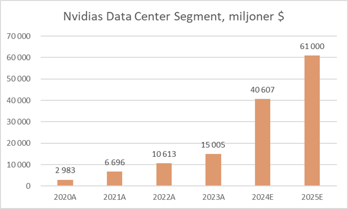 Var kommer då denna framgång ifrån? Redan 2019 när vi först investerade i Nvidia insåg vi hur marknadsledande bolaget faktiskt var, vilket hade möjliggjorts av det egna programmeringsspråket CUDA. Detta språk är en stor anledning till framgången eftersom ingenjörer lärt sig koda Nvidias GPU:er med CUDA. När man först började investera i gaming GPU:er insåg man att denna arkitektur på chipen kunde används för kraftiga beräkningar även inom datacenter och AI i framtiden. Nvidia berättade hur de investerat i ”zero billion dollar markets”, det vill säga man har investerat i produkter för marknader som tidigare inte funnits. Det är exempelvis Nvidias GPU:er som möjliggjort skapandet av både omniverse och generative AI.