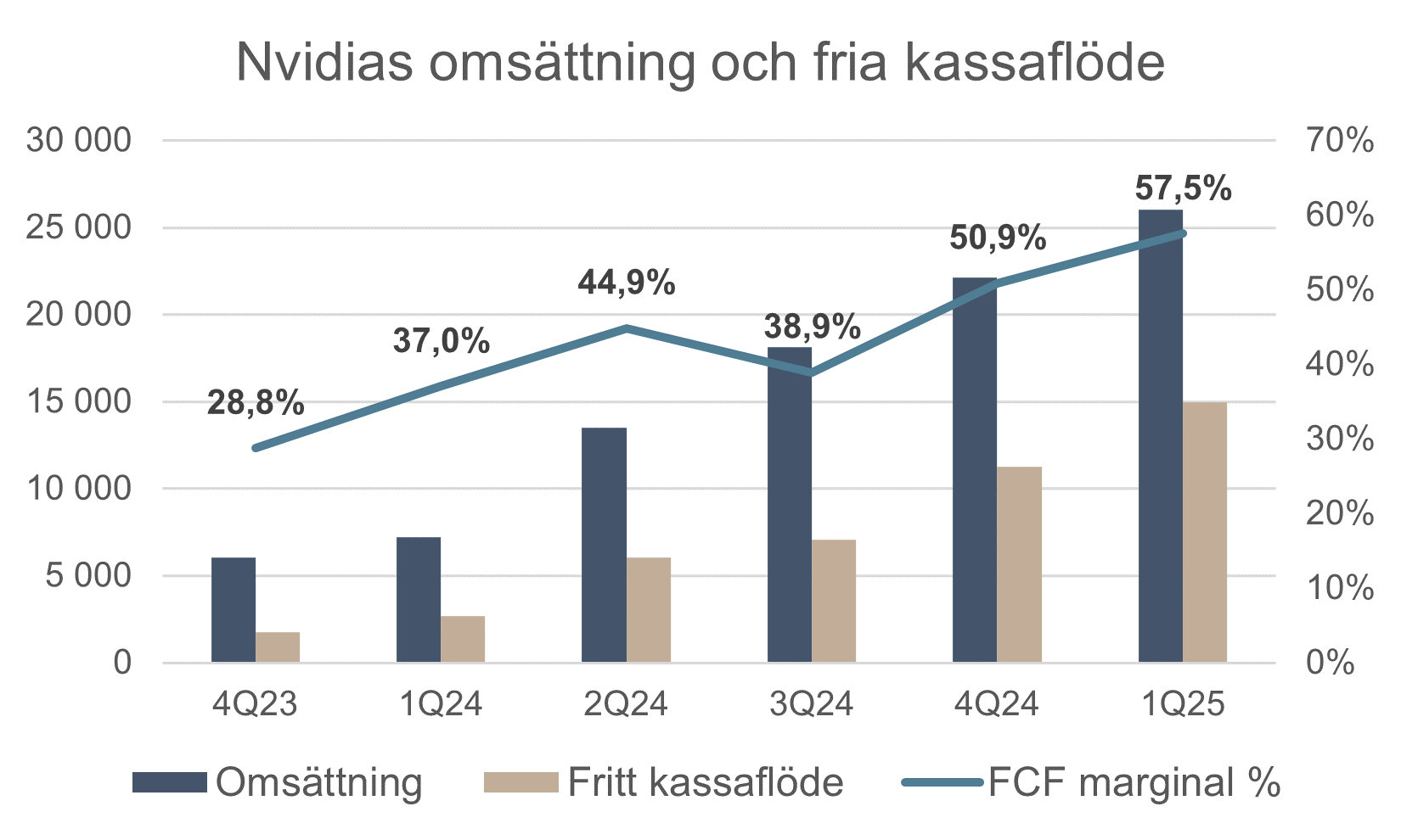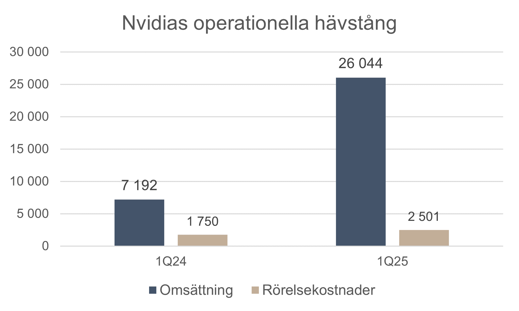 Det som är mest fascinerande med Nvidia, och en fröjd för en aktieanalytiker att se, är deras operationella hävstång. Eftersom Nvidia inte producerar chipen själva utan outsourcar detta till TSMC och enbart designar chipen (med hjälp av mjukvara från Cadence och Synopsys), krävs väldigt lite kapital för att öka omsättningen. För att illusterara detta och visa varför marginalerna kan öka så kraftigt tog jag fram grafen nedan. Den visar att Nvidia detta kvartal, jämfört med förra året, ökade sin omsättning med $18bn (från 7bn till 26bn) medan kostnaderna enbart ökade med knappa $800m. Där snackar vi hävstång som knappt går att finna bland de absolut främsta mjukvarubolagen och visar hur skalbar Nvidias affärsmodell är.