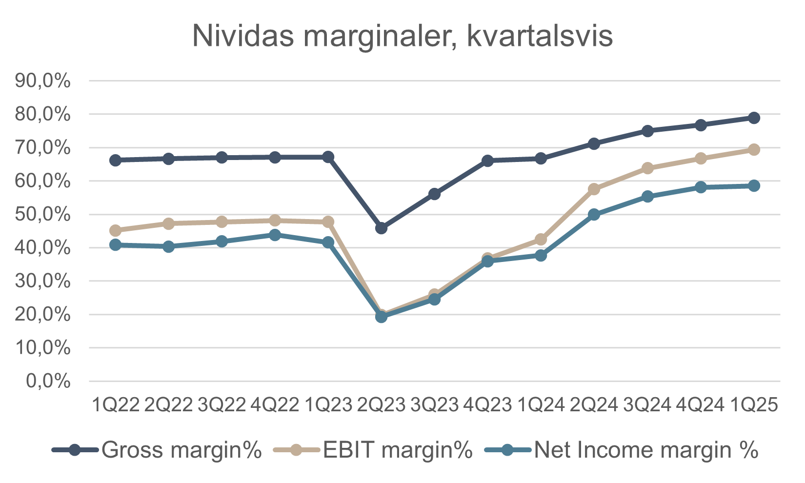 Till följd av den starka utvecklingen i datacenter har även marginalerna lyfts kraftigt eftersom dessa chip har högre marginaler än motsvarande inom exempelvis gaming. Detta har gjort att Nvidias net income margin (vinstmarginal) har gått från 40% till hela 60% det senaste kvartalet. Det innebär i sin tur att mer än hälften av omsättningen för Nvidia omvandlas till vinst, vilket visar vilken stark ”pricing power” man har och vilka värden deras GPUer skapar för kunderna.