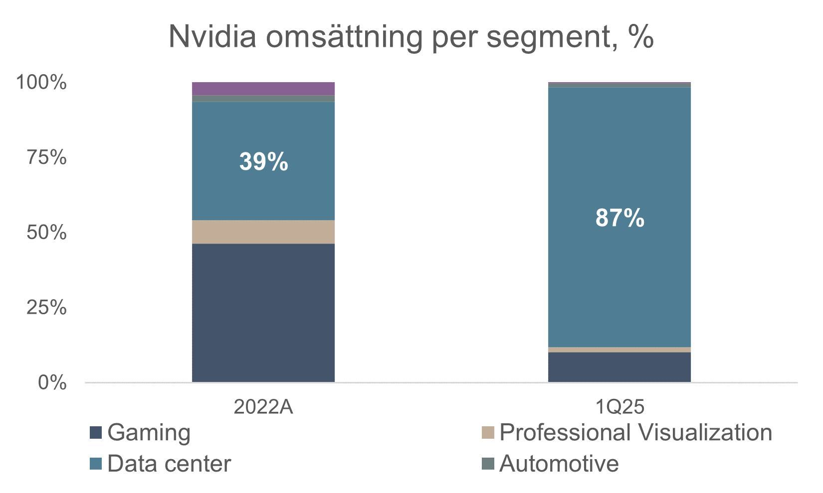 Den starka tillväxten i datacenter har också gjort att detta har blivit Nvidias största segment som senaste kvartalet stod för 87% av omsättningen. För bara två år sedan var motsvarande siffra 39%. Allt annat som Nvidia gör hamnar just nu i skuggan av datacenter, trots det att man har en väldigt spännande plattform för självkörande bilar, som kommer börja ta fart kommande år.