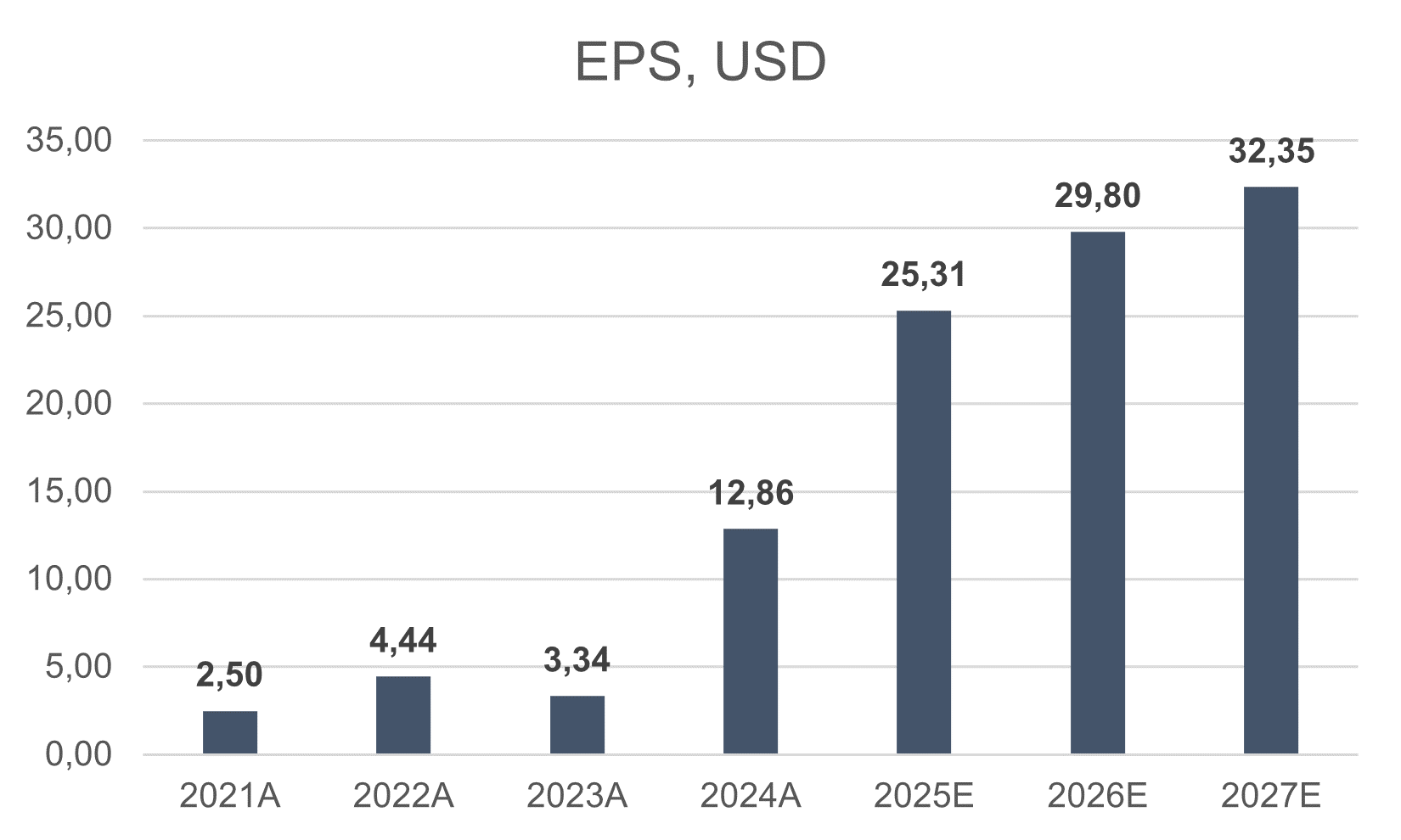 Denna tillväxt har gjort att vinsttillväxten i bolaget har skjutit i höjden vilket man kan se i bilen nedan som visar förväntad tillväxt i vinst per aktie. Under 2024 så fyrdubblade man vinsten och förväntas dubbla denna igen detta år.
