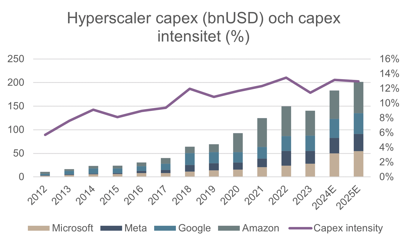 Den stora anledningen bakom den starka tillväxten beror på att kunderna, framförallt hyperscalers i USA, har ökat sina investeringar (capex) i datacenter med i snitt 25% per år de senaste tio åren. Detta är snabbare än deras omsättning som vuxit i snitt 18% under samma period. Detta innebär att intensiteten har ökat och man lägger såldes en större andel av sin omsättning på investeringar idag än tidigare. För tio år sedan la man i snitt cirka 4% av sin omsättningen på dessa investeringar, medans man idag lägger nära 12%. Dessa investeringar består främst av att bygga och utrusta datacenter för att kunna erbjuda sina molnlösningar och nu även AI satsningar, vilket kraftigt har gynnat Nvidia. Under Q1 stod nu dock hyperscalers ”enbart” för 40% av omsättningen efter att i många kvartal i rad utgjort nära 100%, då dessa varit tidiga på bollen att införskaffa sig de senaste GPUerna för att skala upp sina AI satsningar. Detta ska ses som väldigt positivt då resterande 60% kom från enterprise vilket består i allt ifrån biltillverkare, banker och mjukvarubolag som nu också börjar investera kraftigt i egna GPUer för att satsa på AI. På så sätt diversifieras Nvidias kundbas och man blir allt mindre beroende av dessa fyra stora hyperscalers i USA. Detta visar också att AI satsningar är ett brett fenomen bland företag för att kunna öka sin produktivitet genom ökad försäljning och minskade kostnader.