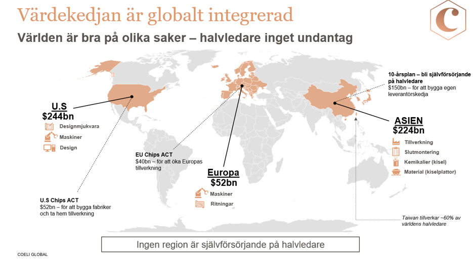 Illustration av värdekedjan för halvledare per region. Källa: Coeli Global.