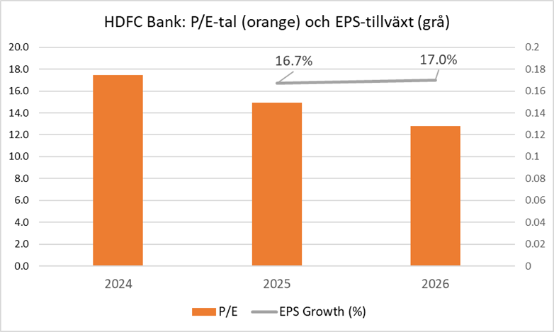 HDFC Banks P/E-tal och vinsttillväxt. Vi tycker bolaget har en attraktiv värderingen med en PEG-kvot nära 1. Källa: Bloomberg.