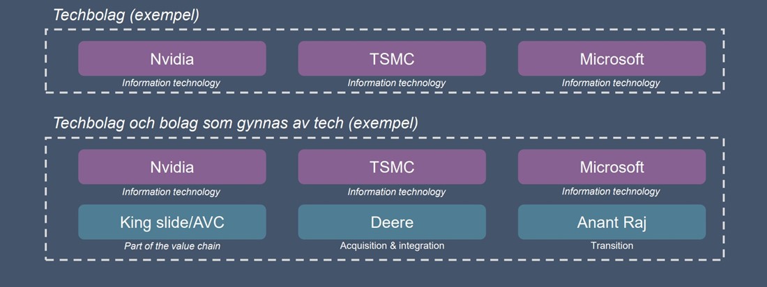 Bild: Exempel på typiska teknikbolag och bolag som gynnas av teknik.