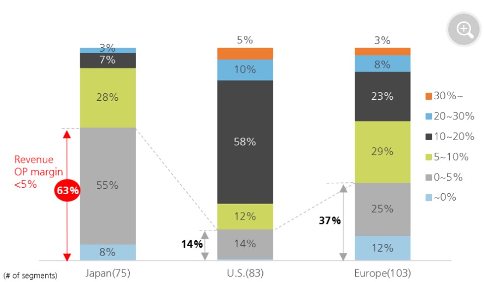 63 % av de japanska bolagen har en rörelsemarginal under 5 %. För USA är den siffran 14 % och Europa 37 %. Förbättringspotentialen är således väldigt stor bland japanska bolag och förbättrade marginaler innebär ökade vinster.