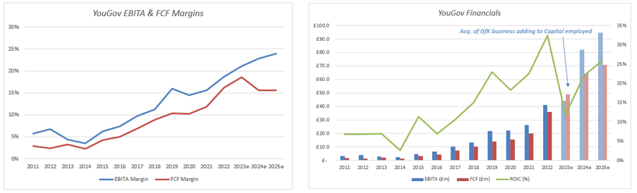 Bild 2. YouGovs utveckling av EBIT-marginal, FCF-marginal, EBITDA, FCF och ROIC.