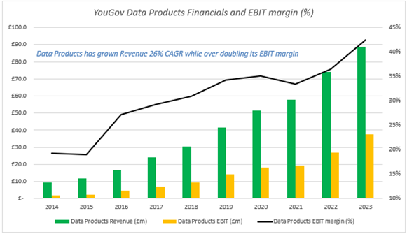 2014 var Data Products 16 % av koncernens EBIT och idag utgör det 62 %, vilket innebär att YouGovs tillväxt har potential att accelerera tack vare att Data Products nu är en betydligt större del av koncernen.
