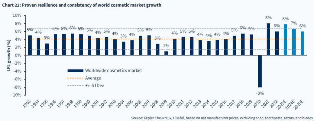 From a holistic perspective, the investment case is relatively simple. Good quality, stable organic growth (high single digits), consistently improving margins, and investments in free cash flow to acquire compelling brands. As seen in the graph below [1], cosmetics is an attractive sector to operate in, growing consistently and stably over time.