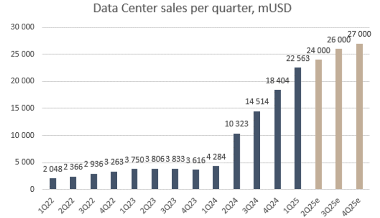 The graph below shows how data centers gathered pace a year ago and have since continued to grow strongly each quarter—something expected in the coming quarters as well. During 2022, Nvidia reported turnover of just over USD 27bn for the year, and it is now expected to report this each quarter going ahead. It is easy to see why the share price has shot up by more than 600% since then.
