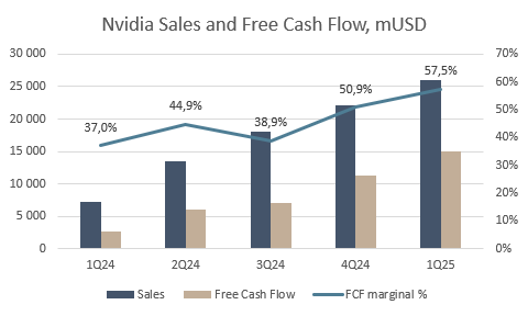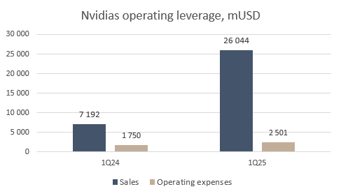Most fascinating about Nvidia, and something that delights an equity analyst, is its operational leverage. As Nvidia doesn’t produce the chips itself—outsourcing their production to TSMC, having designed them (with the help of Cadence and Synopsys)—it takes very little capital to increase its turnover. The graph below illustrates this, showing why its margins can increase so decisively. This quarter, Nvidia improved its turnover by USD 18bn (from USD 7bn last year to USD 26bn), while costs only rose by a scant USD 800m. This is leverage rarely seen even among the very best software companies and it explains how scalable Nvidia’s business model is.