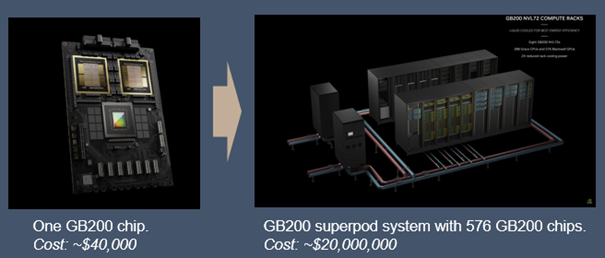 Image. Nvidia’s new chip, GB200, is expected to be launched during Q4. GB200 super-pod is a system with 576 interconnected GPUs that act as one large GPU. Source: Nvidia.