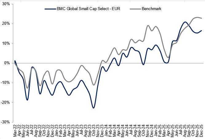 The strongest contributors to the fund's performance in December were FlatexDegiro, Rusta, and Palomar, while the weakest contributors were United Natural Foods, Blue Bird, and Lindex.