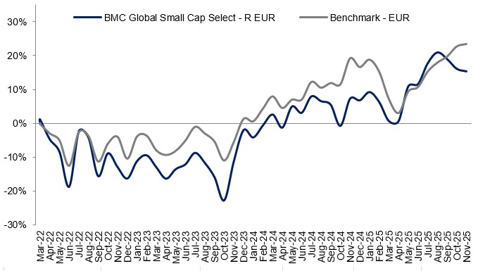 The performance of BMC Global Small Cap Select during November was 0,65% which was 1,26 percentage points short of the fund's benchmark index*.