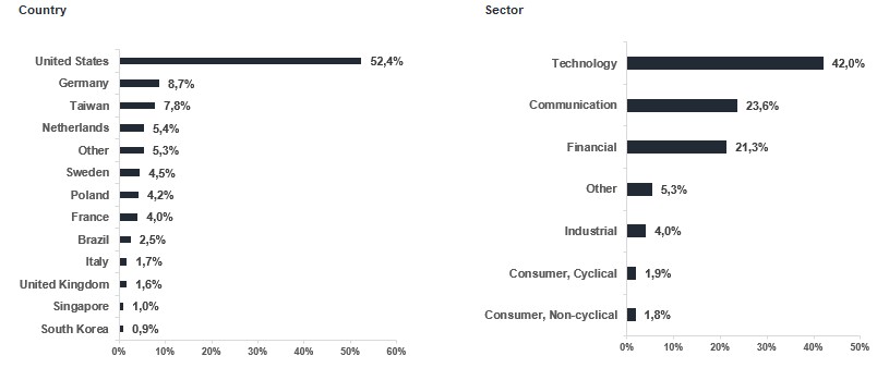 The fund currently comprises 36 companies exposed to a range of sectors, geographies, and driving forces but selected on their own merits. Overall, the portfolio has high forecast profit growth of 26% for the coming year. Our fund is also appealingly valued at a P/E of 21x, which represents a PEG ratio (valuation in relation to profit growth) of less than 1x. We believe that a concentrated but also diversified, actively managed global technology fund that focuses on stock picking has the characteristics to deliver great returns to unitholders over time.