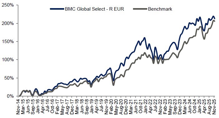 Im November unternahm das Analyseteam zwei Reisen (nach Asien und in die USA), um Portfoliounternehmen aus dem Bestand besuchen und mit neuen interessanten Unternehmen sprechen, die möglicherweise Anlageziele unserer Fonds werden könnten. In Singapur und Japan sprachen wir unter anderem mit SGX Group (Börse Singapur), Sea, Kandenko und Kyoto Financial Group, die alle bereits im BMC Global Select vertreten sind. In den USA sprachen wir mit Unternehmen, die wir in unserem globalen Small-Cap-Fonds haben. Im Dezember reist ein Teil unseres Analyseteams nach Arizona, um an einer Tech-Konferenz teilzunehmen.
