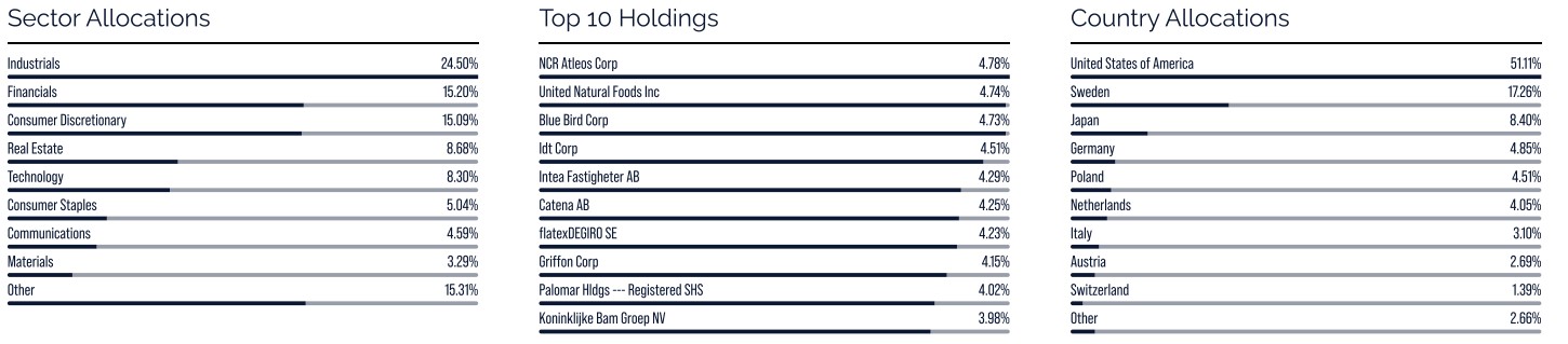 Der Fonds besteht derzeit aus 39 Unternehmen mit Engagement in mehreren unterschiedlichen Sektoren und Regionen, die aufgrund der unternehmensspezifischen Leistungen sorgfältig ausgewählt wurden. Längerfristig sind wir der Ansicht, dass ein konzentrierter, gleichzeitig aber diversifizierter, aktiv verwalteter Small-Cap-Fonds mit dem Schwerpunkt Stock Picking die Voraussetzungen bietet, um eine gute Rendite für die Anteilsinhaber zu erwirtschaften.
