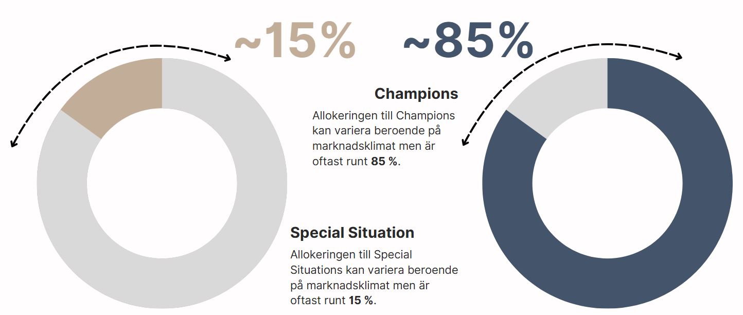 När det gäller portföljsammansättningen är Champions grunden i portföljen och utgör den större delen, cirka 85 %, medan Special Situations utgör en mindre del, cirka 15 %.Denna fördelning kan dock ändras beroende på marknadsklimat där Special Situations kan ökas upp till maximalt 33 % av den totala portföljen. Exempelvis finns det ofta många bra bolag till riktigt låga värderingar efter en större börsnedgång. Det väljer vi att utnyttja till vår fördel genom att öka upp andelen Special Situations i portföljen när det är turbulent på börsen.