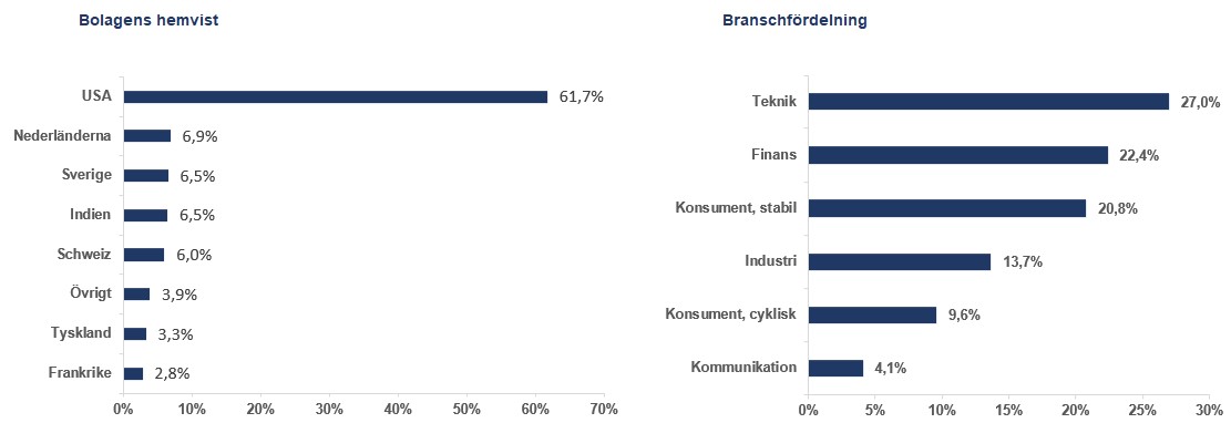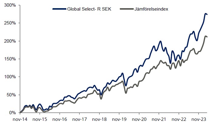 Bra bolagsrapporter från till exempel indextunga namn som Apple, Google och Microsoft och kommunikationen kring kommande räntesänkningar från Federal Reserve påverkade marknaden under månaden. Även konflikten mellan Iran och Israel hade en inverkan då det inte blev en större vedergällningsattack från Israel, vilket hade skalat uppkonflikten ytterligare. Marknaden kunde dra en lättnades suck och i stället fokusera på annan makro-data. Just nu är det fullt fokus på amerikansk inflations- och arbetsmarknadsstatistik för att skönja minsta tecken på en framtida sänkning av den amerikanska styrräntan. Marknaden har gått från att tro på flera sänkningar under året till att i stället tro på en till två sänkningar efter sommaren.