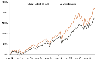 Vi har en synnerligen intressant globalfond, vars innehav bestående stabila Champions och lågt värderade Special Situations, har en prognostiserad vinsttillväxt på mer än 17% mellan 2023 och 2024. Den aggregerade omsättningstillväxten för bolagen under samma period är mer än 11%. Vi tycker att detta är attraktivt i en värld där många länder kämpar för att växa sin BNP och undvika recession.