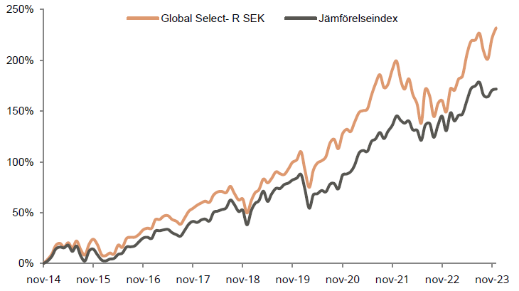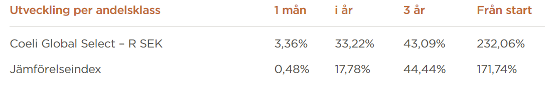 Utvecklingen för Coeli Global Select under december månad var 3,4%, vilket var 2,9 procentenheter bättre än vårt jämförelseindex. En av förklaringarna till den starka börsuppgången i december var att marknadsräntorna föll som en konsekvens av gynnsamma inflationsdata, och efterföljande förväntningar på räntesänkningar under 2024. Detta ledde till ett ökat intresse för aktier och i synnerhet aktier som har haft ett tufft 2023 som till exempel fastighets-, konsument- och småbolagsaktier. Vi noterar också att vår globalfond levererar stabil avkastning i en miljö både med starkare och svagare dollar.