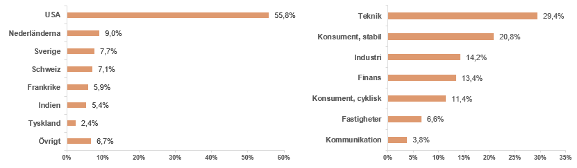Under december föll den amerikanska 10-årsräntan från cirka 4,3% till cirka 3,9%. Marknaden fortsatte att diskontera kommande räntesänkningar från Federal Reserve, vilket blev en katalysator för aktiemarknadens uppgång. Den senast uppmätta inflationen i USA på cirka 3,1% innebär att den fortsätter närma sig Federal Reserves mål på 2%. När inflationen bevisligen faller, finns det ingen anledning för FED att ha kvar styrräntan på höga 5,5%, utan man kommer sannolikt att sänka. I skrivande stund så indikerar terminsmarknaden att Federal Funds Target Rate kommer att ligga på cirka 4,5% i augusti 2024. Får marknaden rätt blir det förmodligen fyra sänkningar på 0,25 procentenheter, under årets första tre kvartal. Lägre räntor kommer att gynna den reala ekonomin vilket gör att fastighetsmarknaden kommer komma i gång igen. Lägre ränteutgifter gör att vi kommer få mer pengar i plånboken vilket betyder att bland annat bilförsäljningen, konsumtionen i stort och semesterresorna kommer att öka. En miljö med sjunkande ränta kommer gynna räntekänsliga aktier.