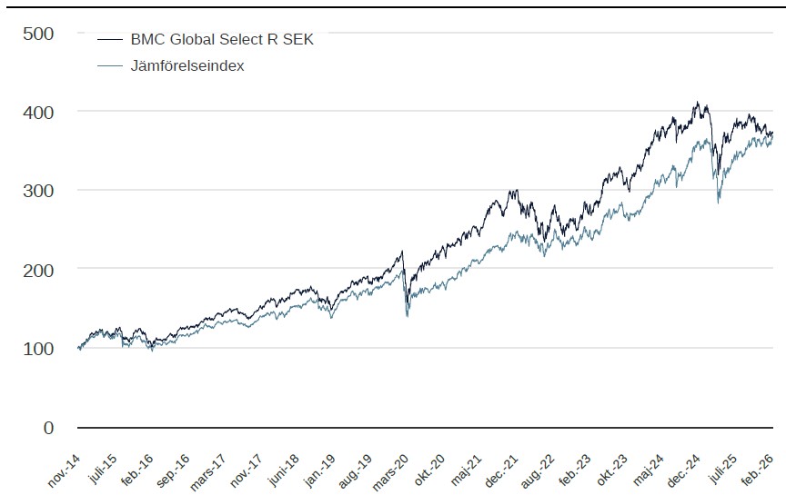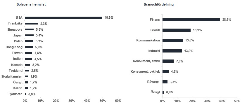 Fonden består just nu av 34 bolag med exponering mot en rad olika sektorer och geografier vilket skapar en väl diversifierad portfölj av fina bolag, med starka balansräkningar och hög vinsttillväxt. Över tid så är vi övertygade om att detta är rätt recept för tillväxt för er, våra andelsägare, att bygga ert långsiktiga kapital.