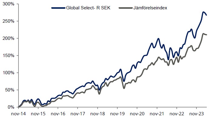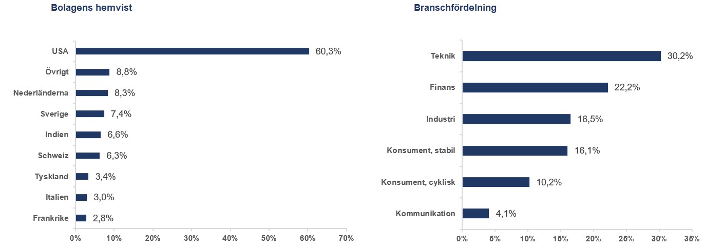 Vår ambition är att investera i en portfölj av Världens Finaste Bolag och vi är glada att kunna skriva att vi aldrig haft en starkare och mer balanserad portfölj än den vi har just nu. Som globalfond kan vi positionera oss mot de starkaste trenderna i världen, må det vara Indien, AI eller någon annan, och 2024 har alla ingredienser för vad som kan bli ett riktigt bra börsår.