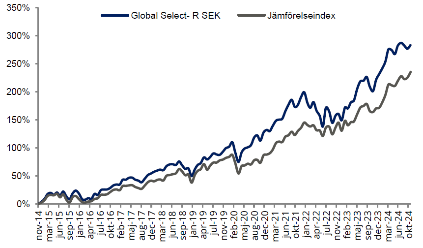 I globalfonden har vi en intressant blandning av starka Champions och spännande Special Situations. Vi bedömer att höstens räntesänkningar kommer vara en viktig drivare för avkastningen framåt. En annan positiv faktor för aktiemarknaden är att det amerikanska presidentvalet är klart och vi nu kan lägga det bakom oss. I skrivande stund har BMC Global Select en prognostiserad aggregerad vinsttillväxt på mer än 16% för det kommande året, vilket kommer bidra positivt till fondens framtida avkastning.