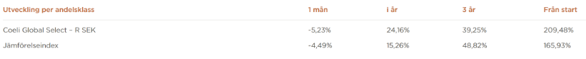 Coeli Global investerar inte i olje- eller gasbolag av hållbarhetsskäl, vilket gjorde att vi tappade relativt i avkastning mot energibolagen. Aktiemarknaden präglades återigen av oro kopplat till utvecklingen av marknadsräntorna vilket resulterade i negativ utveckling av aktiekurserna.