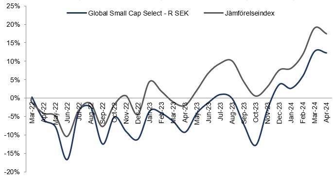 Bra bolagsrapporter från till exempel indextunga namn som Apple, Google och Microsoft och kommunikationen kring kommande räntesänkningar från Federal Reserve påverkade marknaden under månaden. Även konflikten mellan Iran och Israel hade en inverkan då det inte blev en större vedergällningsattack från Israel, vilket hade skalat uppkonflikten ytterligare. Marknaden kunde dra en lättnades suck och i stället fokusera på annan makro-data. Just nu är det fullt fokus på amerikansk inflations- och arbetsmarknadsstatistik för att skönja minsta tecken på en framtida sänkning av den amerikanska styrräntan. Marknaden har gått från att tro på flera sänkningar under året till att i stället tro på en till två sänkningar efter sommaren.