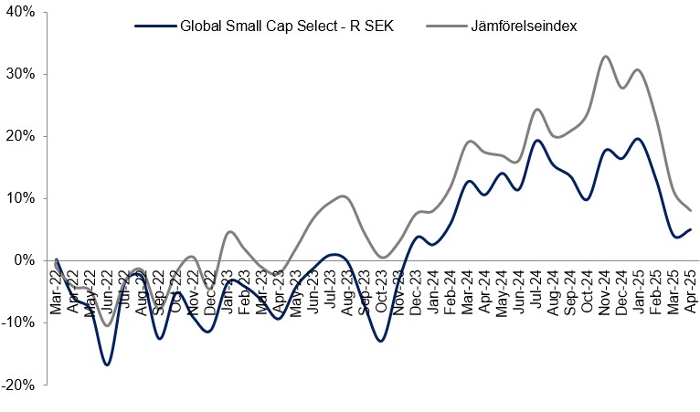 April kom helt att präglas av tullar och den pågående rapportperioden. Sedan den andra april, och den så kallade ”liberation day”, är osäkerheten fortsatt stor kring tullnivåerna och dess följdeffekter, men vi ser också att många företag indikerar mycket begränsad påverkan hittills. Det finns inte mycket hårda data som pekar på någon större inbromsning att tala om här och nu, förutom när det gäller själva handeln mellan Kina och USA samt transportsektorn i USA. Materian är dock flyktig men under de senaste veckorna så pekar mycket på att tonläget har lugnats ned betänkligt. Att det blir någon sorts överenskommelse mellan Kina och USA är av stor vikt och vi räknar med att börsen kan vara fortsatt slagig under kommande månad, men också att vinnare respektive förlorare kommer utkristalliseras tydligare allt eftersom de nya förutsättningarna sjunker in. Vi jobbar kontinuerligt med att positionera fonden så att den är fylld av dessa vinnare så att ni som andelsägare kan dra fördel av det som händer i världen.