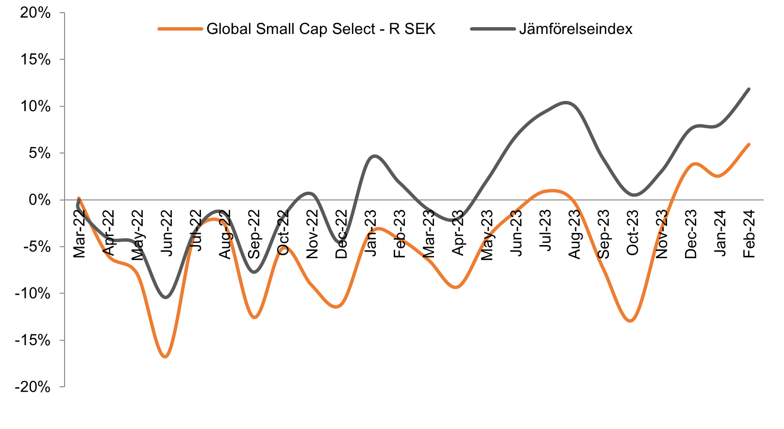 Det vi har sett under de två första månaderna av 2024 är att marknadsräntorna studsat tillbaka till lite högre nivåer vilket har påverkat marknadssentimentet kring småbolag. Vi noterar dock att marknadens reaktioner vid rapporttillfället, under den senaste rapportperioden, i de flesta fall är mer positiva än negativa. Vi har sett en viss förstärkning av kronan mot den amerikanska dollarn vilket är ett tecken på att marknaden börjar gilla lite mer ”risky assets”. Den senaste datapunkten gällande amerikansk inflationsstatistik visar att inflationen fortsätter att falla även om förändringen från föregående månad var liten.