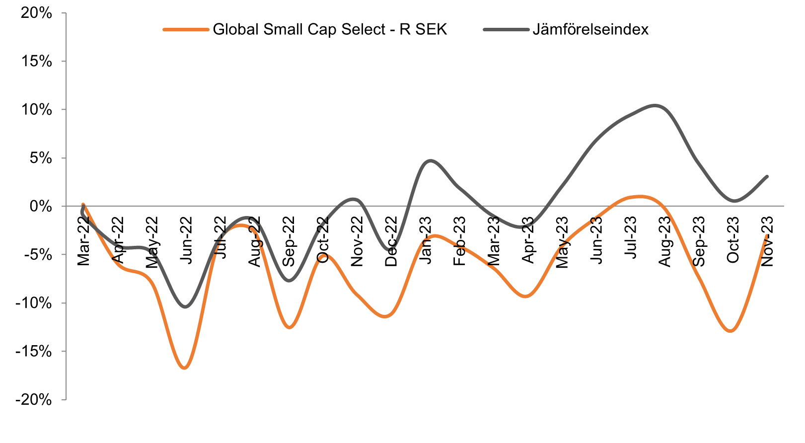 Månadens avkastning i den globala småbolagsfonden visade vilken kraft det kan vara i tillgångsklassen småbolag. Trots den fina uppgången den senaste tiden är värderingen fortsatt låg i relation till stora bolag. Som förvaltare kan vi alltid påverka vilka bolag vi investerar i. Vi kan dock inte påverka när marknaden ska börja dela vår syn och belöna dessa fina kvalitetsbolag med stigande aktiekurser. Månadssparande kan vara ett ypperligt sätt, att som sparare ta bort störningsmomentet att försöka tajma marknaden och förutspå när uppgången kommer. När börsen väl fattar tycke för något, exempelvis småbolag, brukar det gå snabbt.