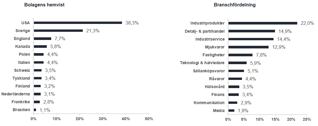 De aktier som gav det bästa bidraget under månaden var United States Lime & Mineral, Enghouse System och Volution. De aktier som hade den svagaste utvecklingen under månaden var Elmos Semiconductor, Rev Group och Pagseguro.