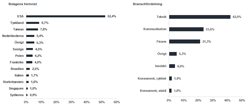 Fonden består just nu av 36 bolag med exponering mot en rad olika sektorer, geografier och drivkrafter som är noga utvalda på bolagens egna meriter. Portföljen i sin helhet har en fortsatt hög prognostiserad vinsttillväxt på 26% för nästkommande år. Fonden anses även vara väldigt attraktivt värderad på P/E 21x, vilket motsvarar en PEG-kvot (värdering i förhållande till vinsttillväxt) på under 1x. Över tid är vår bedömning att en koncentrerad, men samtidigt diversifierad, aktivt förvaltad global teknologifond med fokus på stockpicking har förutsättningarna att leverera god avkastning till andelsägarna.