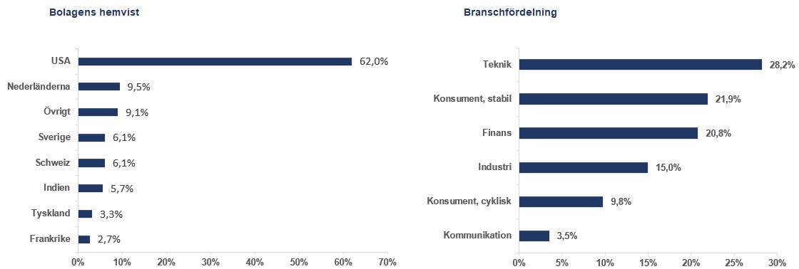 Fondens bästa bidrag under månaden kom från halvledarbolaget NVIDIA, luftkonditionerings-, värme- och kylutrustningsdistributören Watsco samt bilföretaget Stellantis. Det glädjer oss extra mycket när fonden har avkastningskällor från många olika industrier, då det visar kraften i att ha en diversifierad global portfölj.
